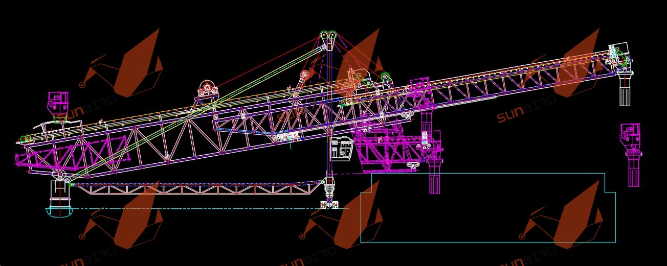 本次装船机和皮带机的设计采用了模块化设计理念主要针对了在非洲港口的安装条件差安装难度高进行的特殊处理。每一件的重量都控制在非洲港口的特殊要求上,且大件都采用螺栓连接,避免了现场的焊接工作量,保证了安装的进度和精度要求。该项目的装船机是给无锡松邦科技有限公司制造的,设备包括了内外臂架、伸缩机构、俯仰机构、大车行走机构(行走采用轮胎式)、司机室、电气室等。装船机主要是用来承接内场来的物料通过皮带输送至装船机的接料斗上,再通过内外臂架上的皮带机输送向船舱内送料。臂架伸缩机构、俯仰机构和大车行走机构的合理组合可以适应不同的船型及涨潮落潮工作环境。。主体结构采用了桁架结构形式,即控制了整机重量降低了土建投入成本,又减轻了港口风载荷对设备的影响,属于目前港口装船机最先进的结构形式。
