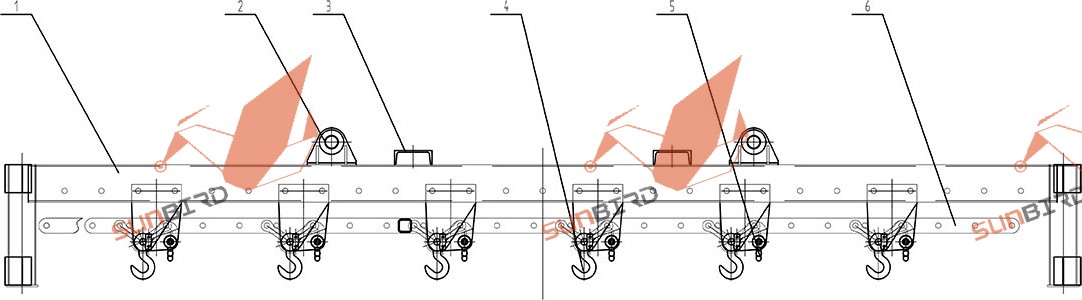 1. 吊架、2吊耳、3.叉车吊点、4.吊钩、5.锁扣、6.连杆机构